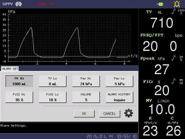 12. Tidal Volume Alarm: Upper Limit 10~2000ml,Lower Limit:0~1800ml